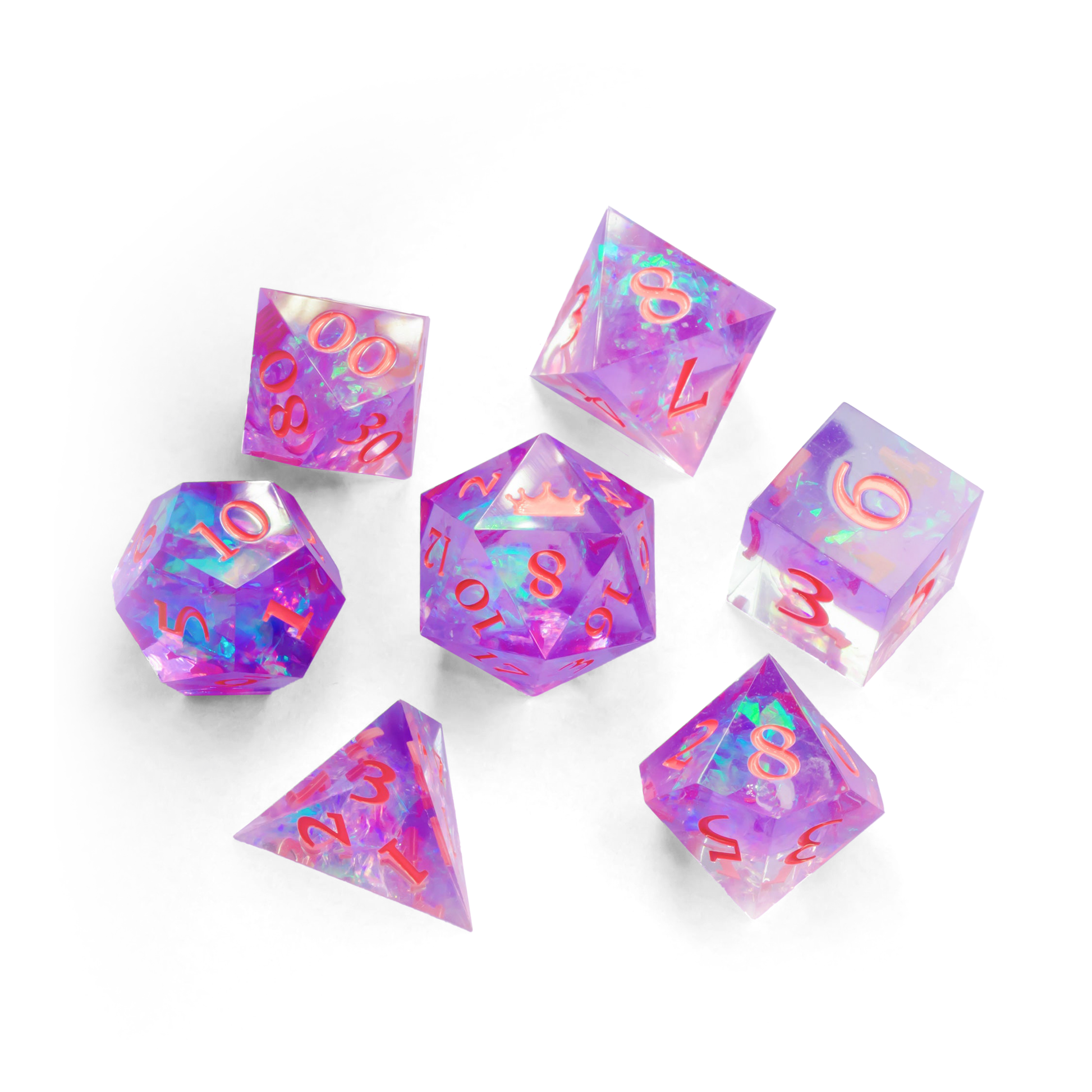 Set of seven hand polished resin dice. Each set includes a D4, D6, D8, D10, D%, D12, and a D20. Due to the nature of the material, each set of dice will differ slightly from one another.
