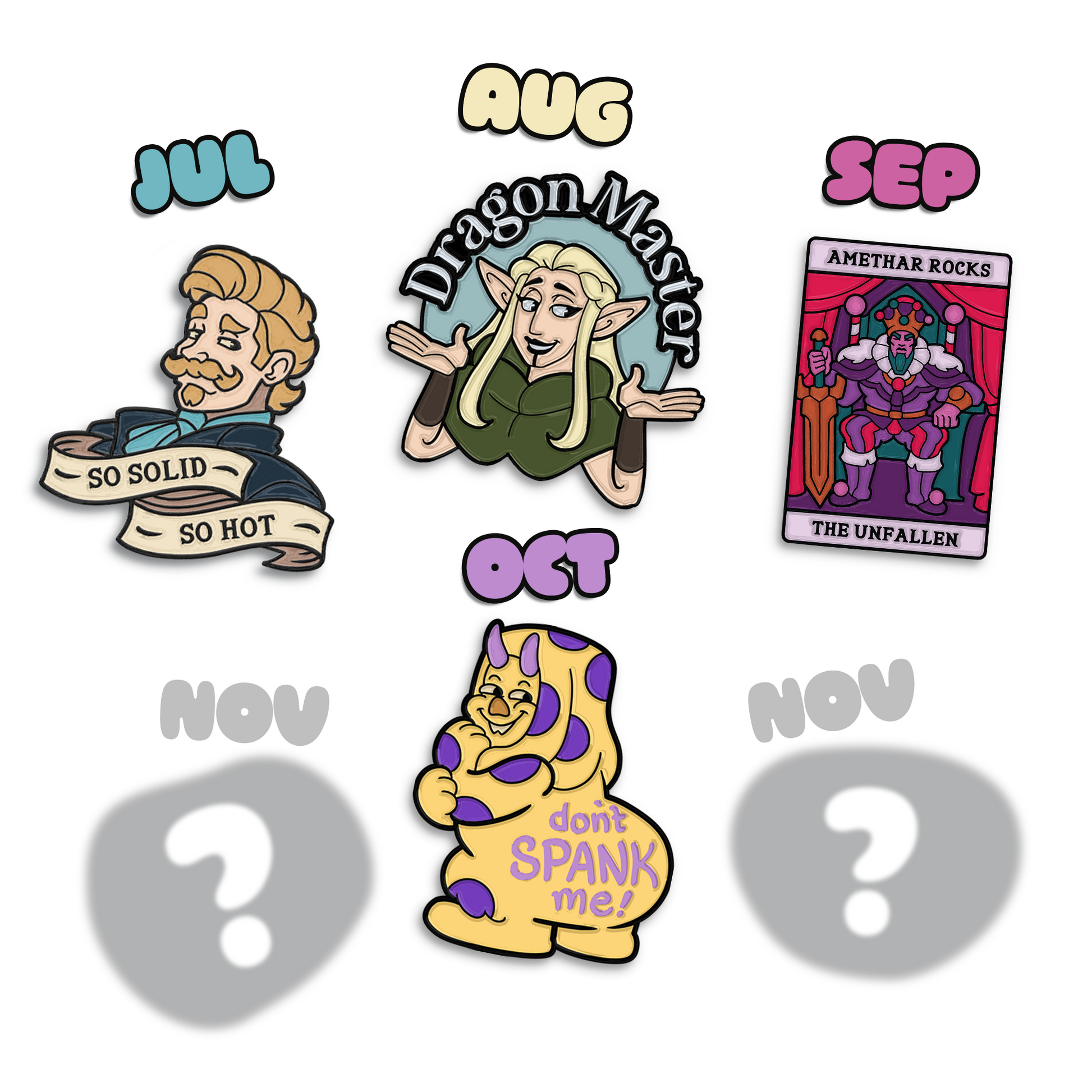 Made specifically for our fans in other countries who want to save a bit of money on shipping the monthly pins, this bundle is also great for people who forget what month it is, folks who realized that we have a merch store 4 months after their favorite pin dropped, and of course, people who prefer packages with 6 pins inside instead of just one.