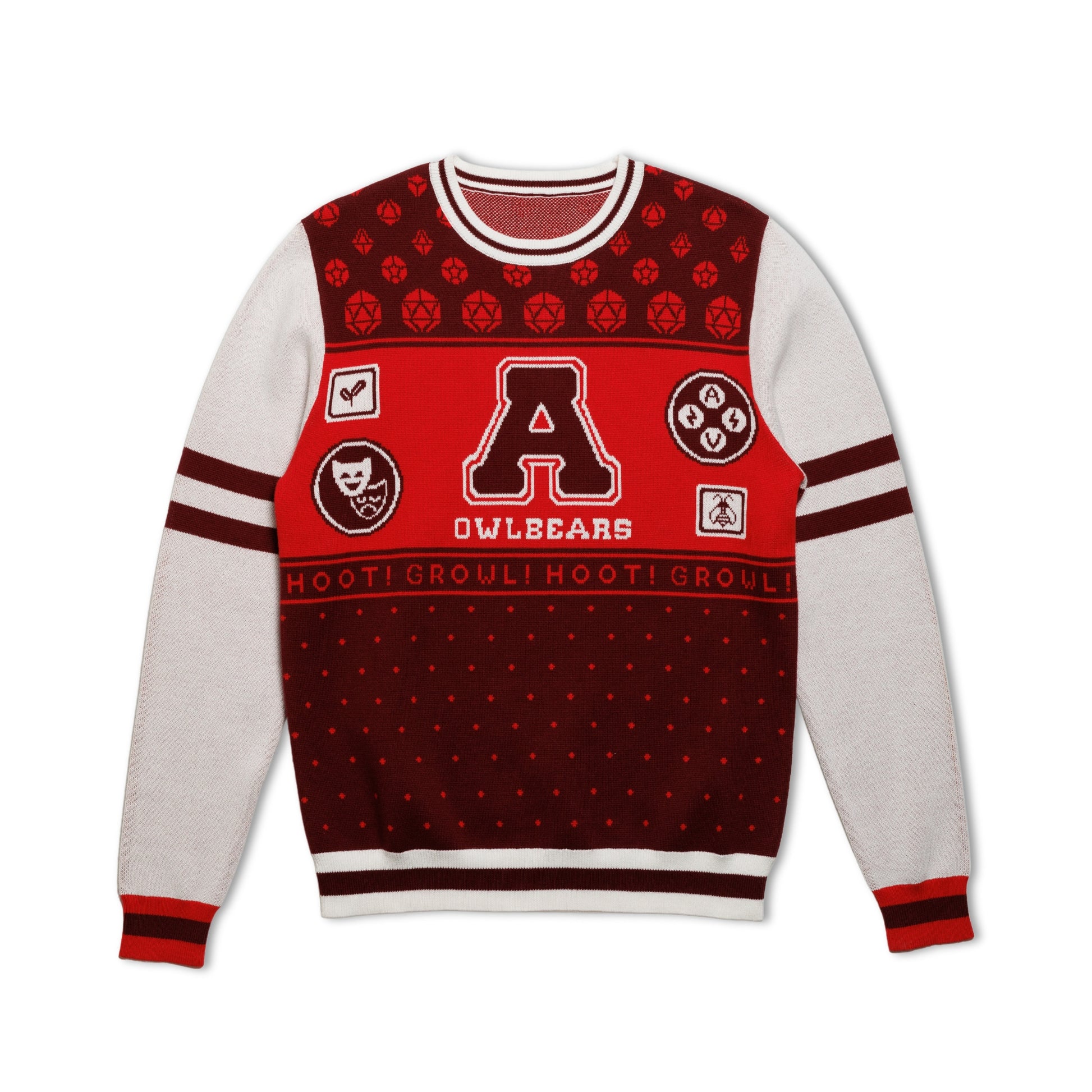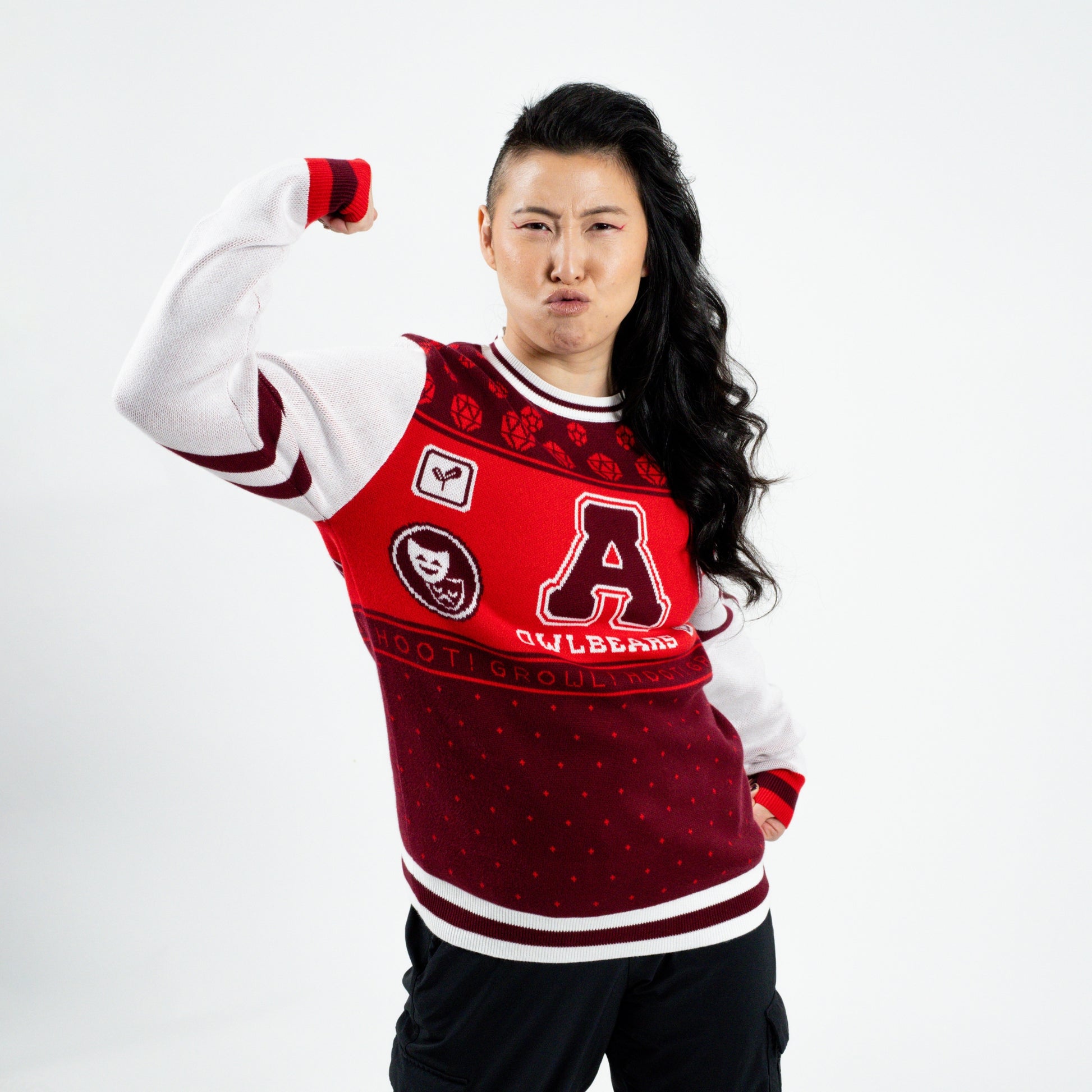 Show your Aguefort Adventuring Academy school pride with this holiday sweater featuring emblems from some badges from the many clubs joined by Riz Gugak and the rest of the Bad Kids of Dimension 20 Fantasy High. Art by Christina Pepper Moliterno @hipepper