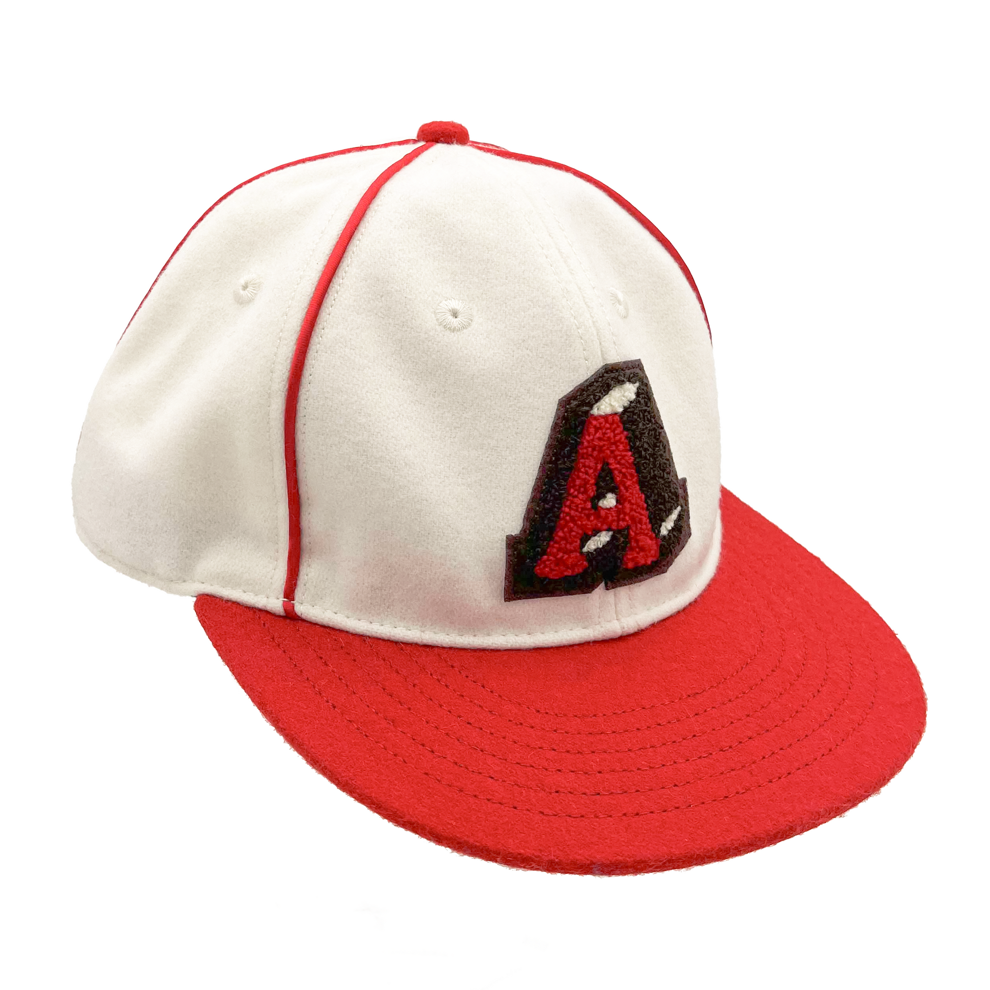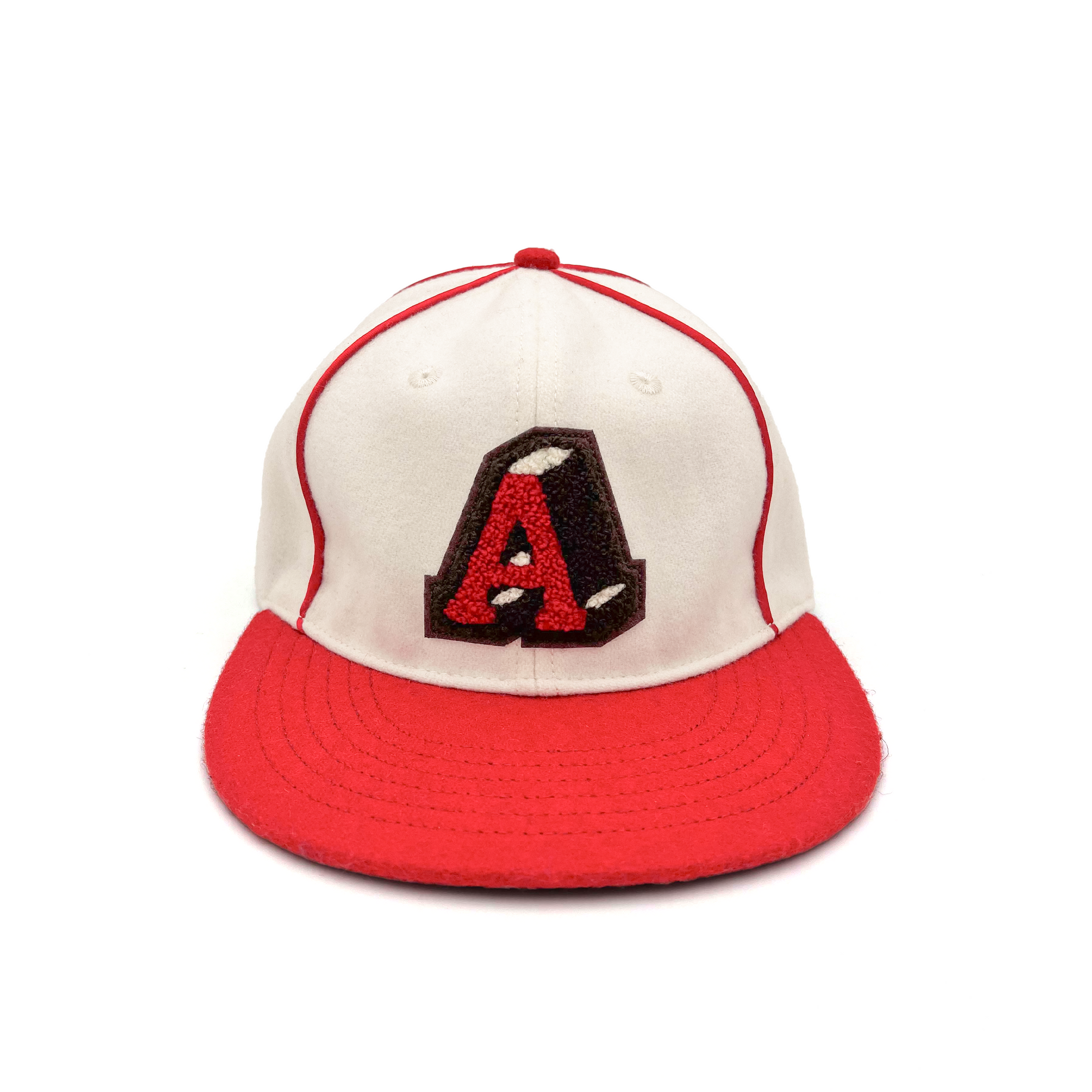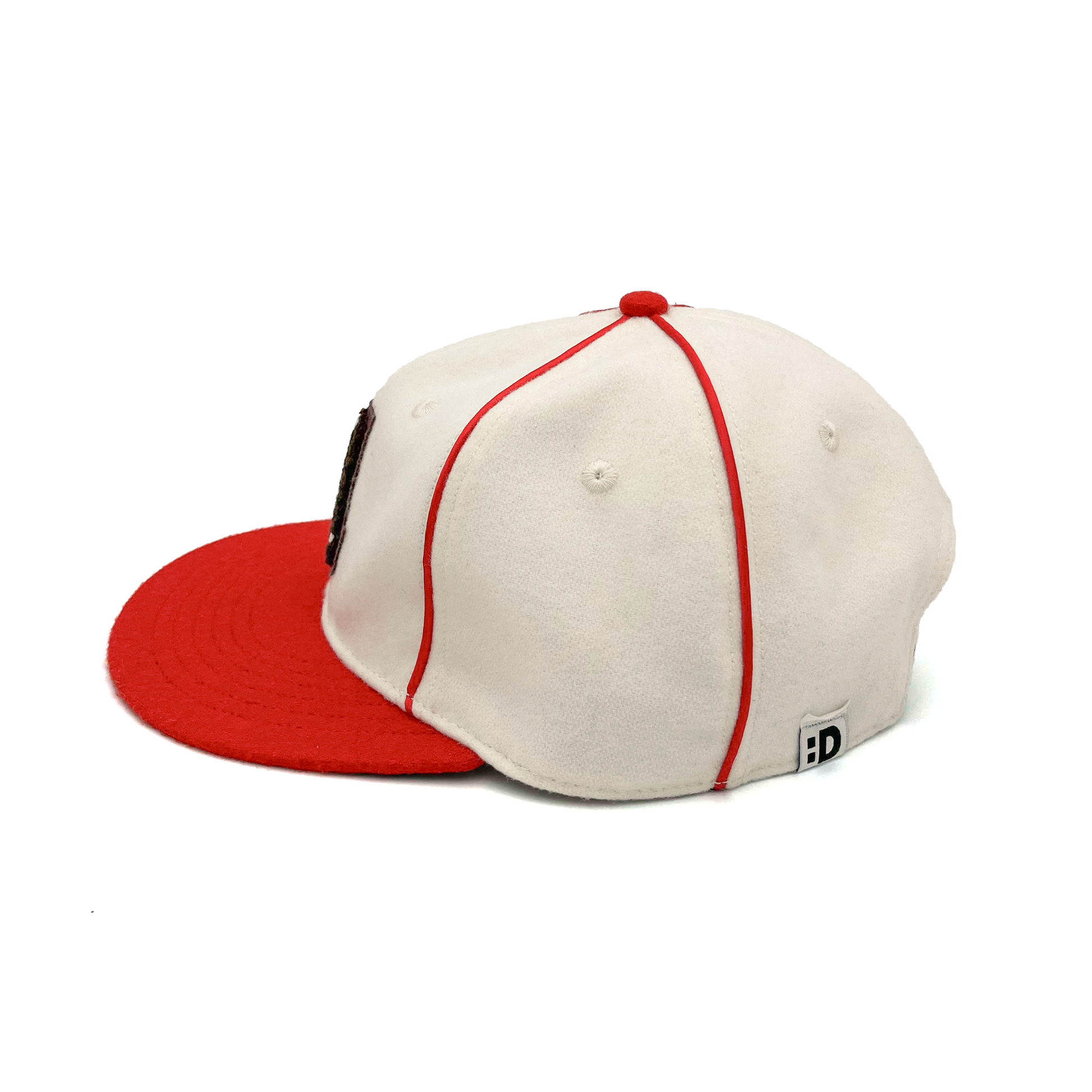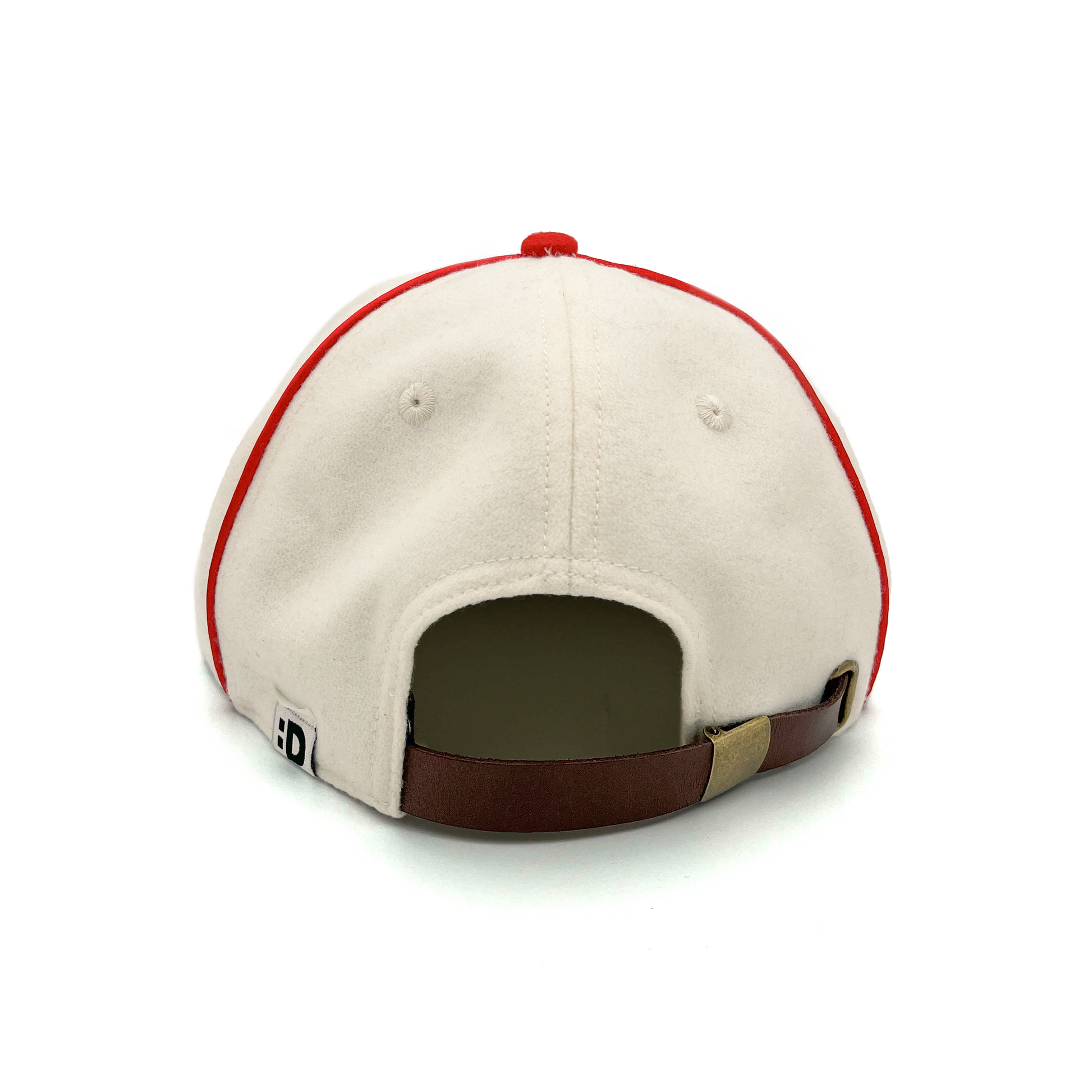 Vintage shape, 6 panel unstructured melton ballcap with red satin piping, green satin under visor, leather and brass closure, and chenille patch. One size fits most