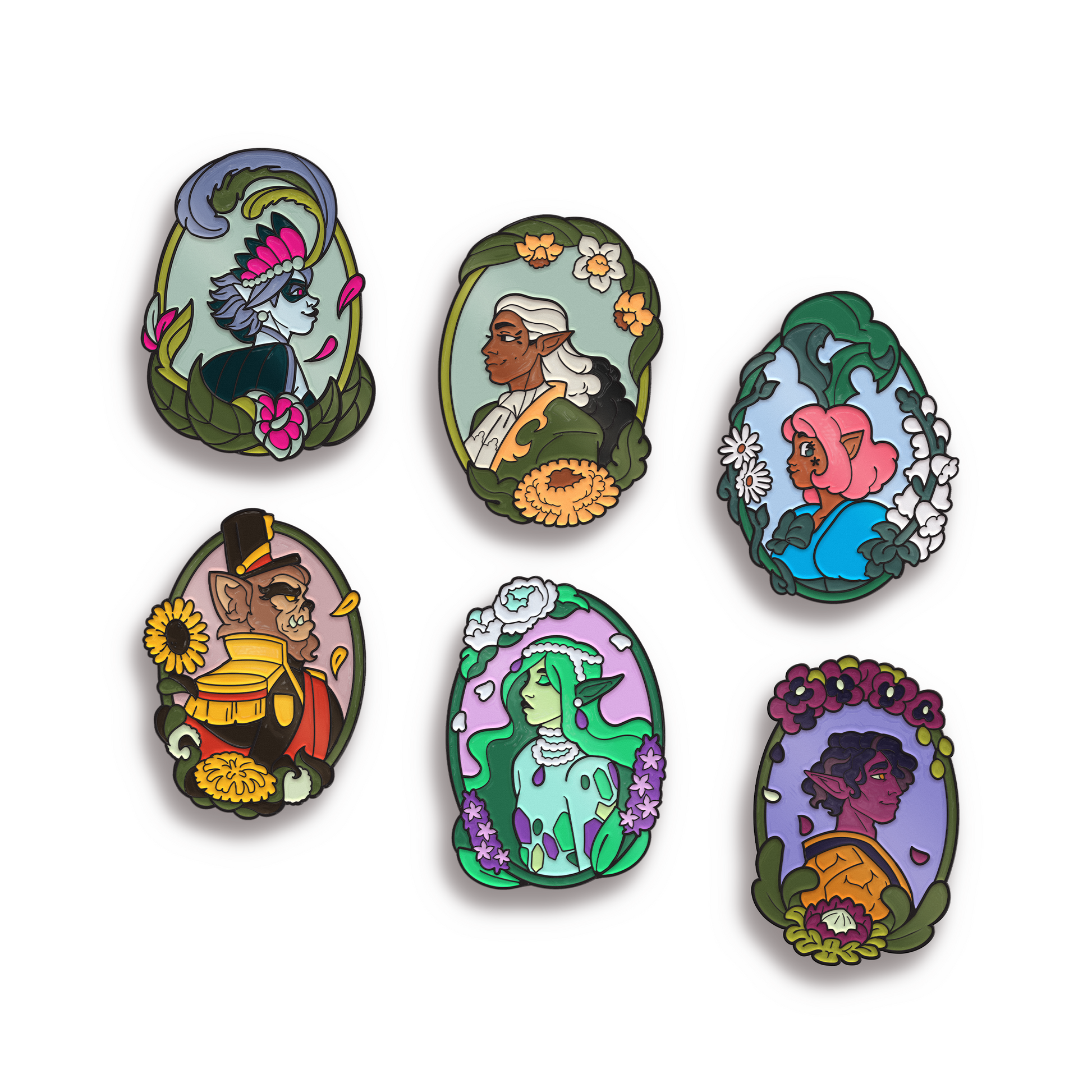 Regardless of one's previous reputation, we know of few ways to more quickly achieve good standing than for one to possess these enamel pins depicting the Pack of Pixies from Dimension 20: A Court of Fey & Flowers. If not for the sake of one's status then perhaps for the sake of one's lapel. Art by Ali @devildaisies