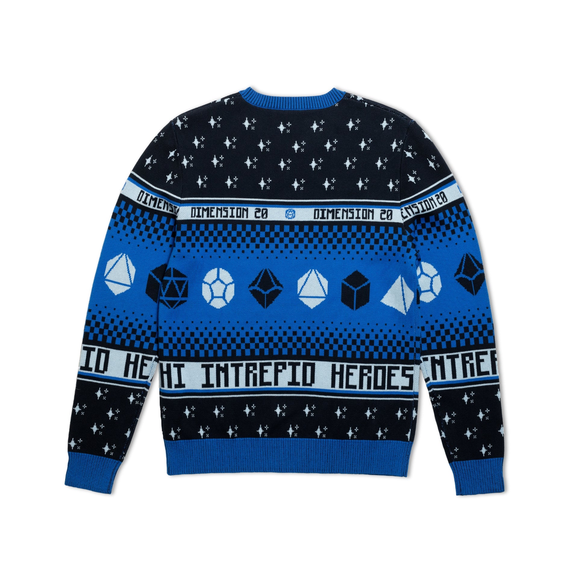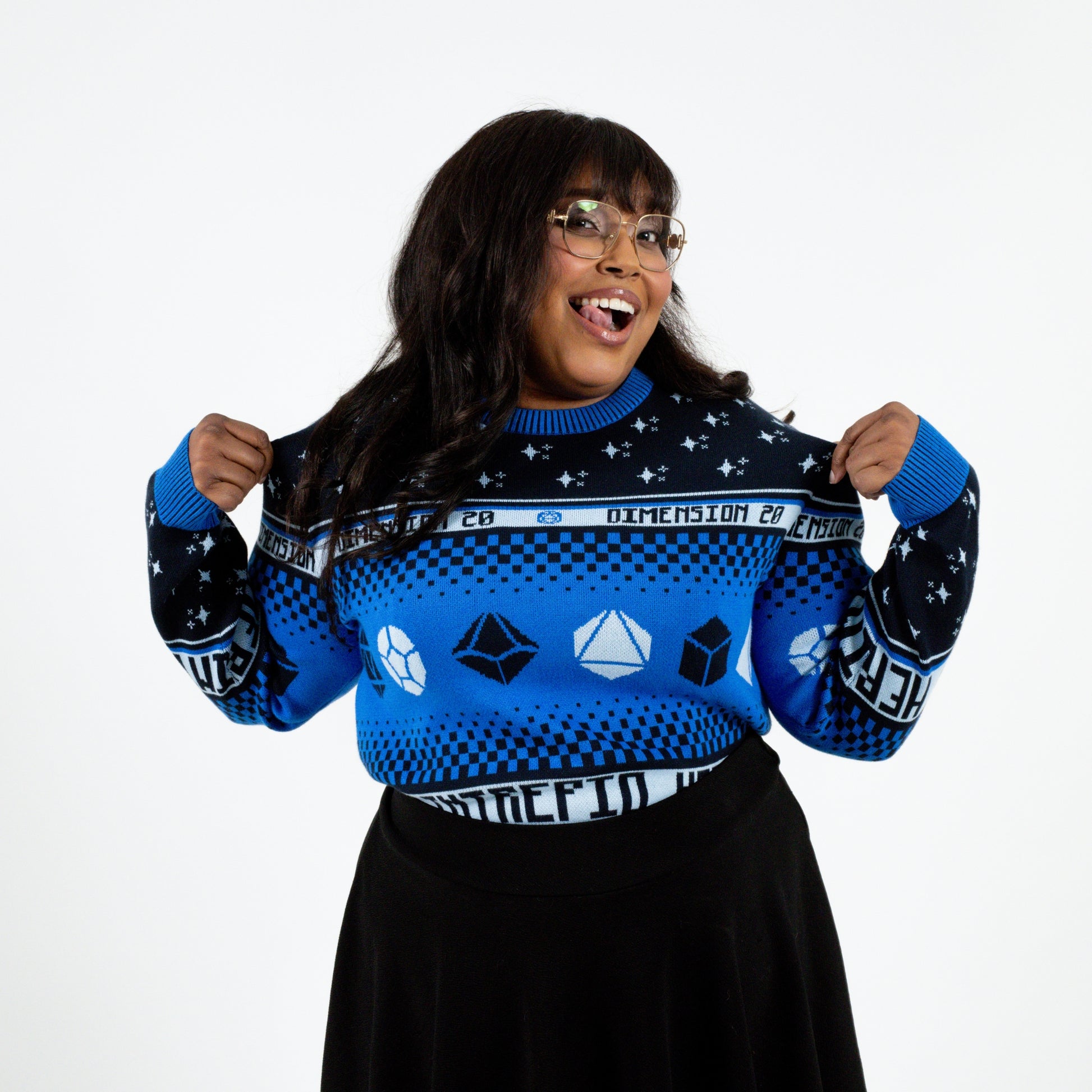 Be the big bad well-dressed person at your next game night with this gorgeous Dimension 20 Holiday Sweater. Art by Christina Pepper Moliterno @hipepper