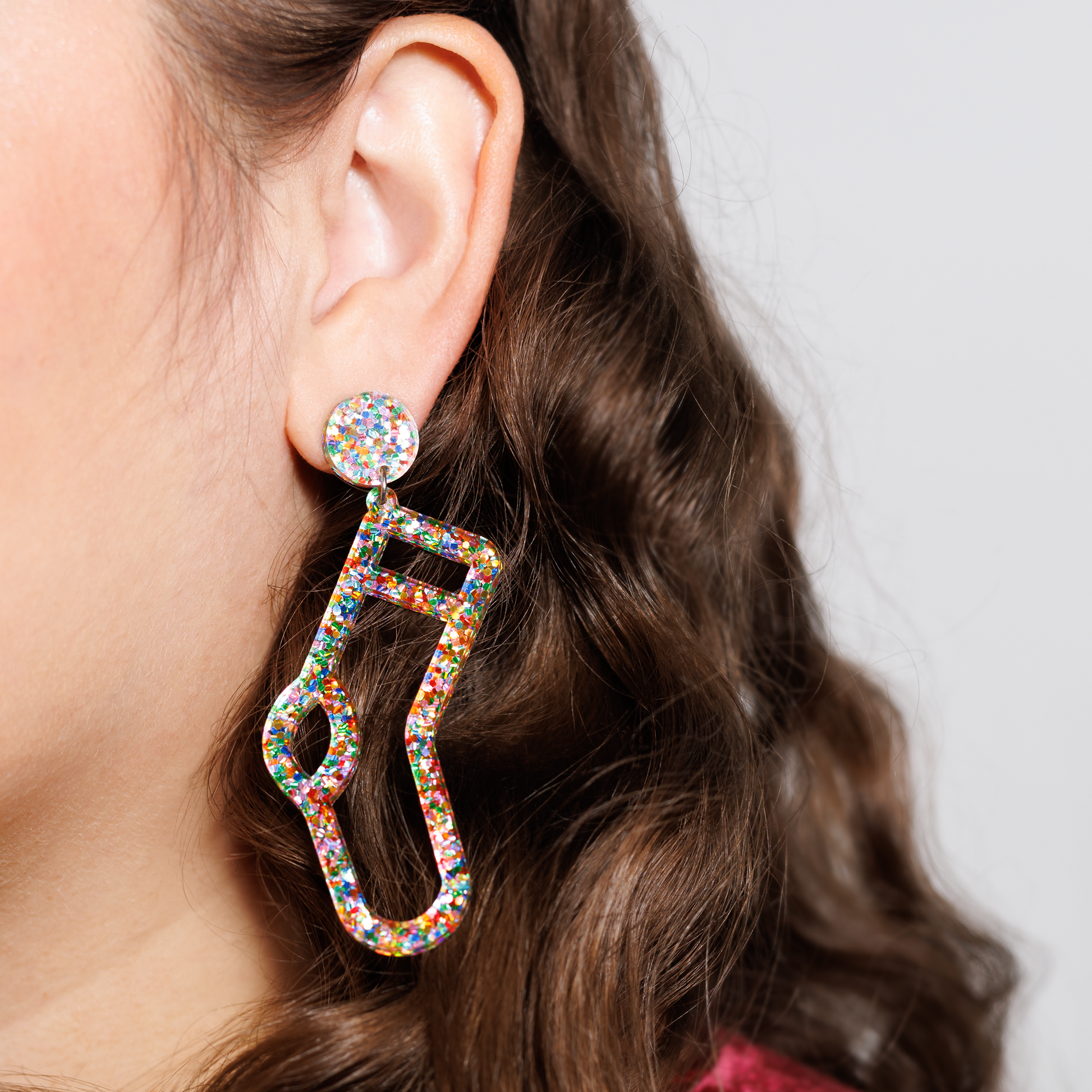 Laser cut acrylic with stainless steel jump ring findings and titanium ear posts. Each earring ~3.25"x~1.5" including post, box is 5-1/4" X 3-3/4" X 7/8"