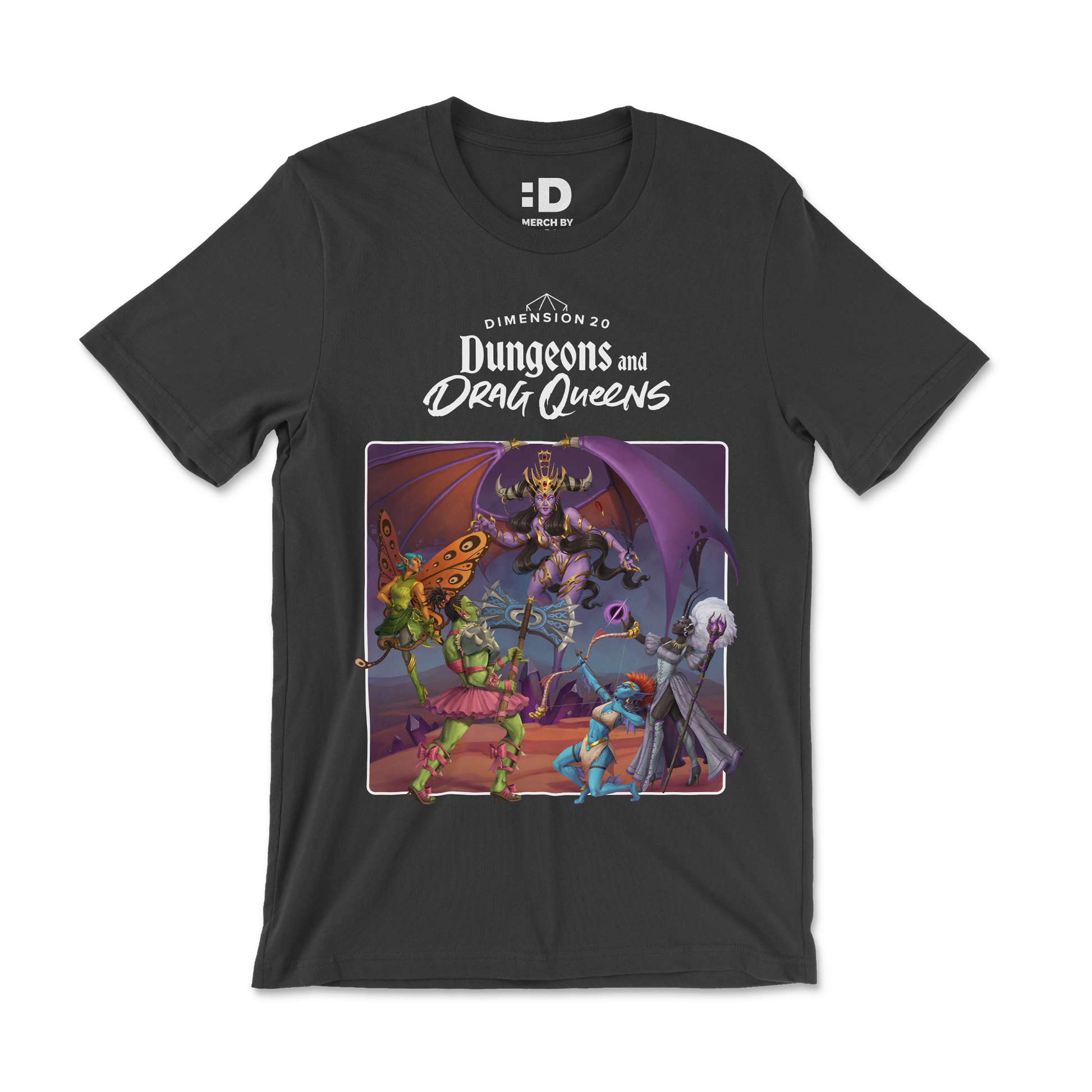 The prompt for the Dimension 20: Dungeons and Drag Queens t-shirt was “classic high fantasy oil painting illustration meets the world of drag.” The prompt for wearing this shirt was “dopest t-shirt you could wear to both a brunch and a game night” Art by Lauren Rowlands @Larn_draws