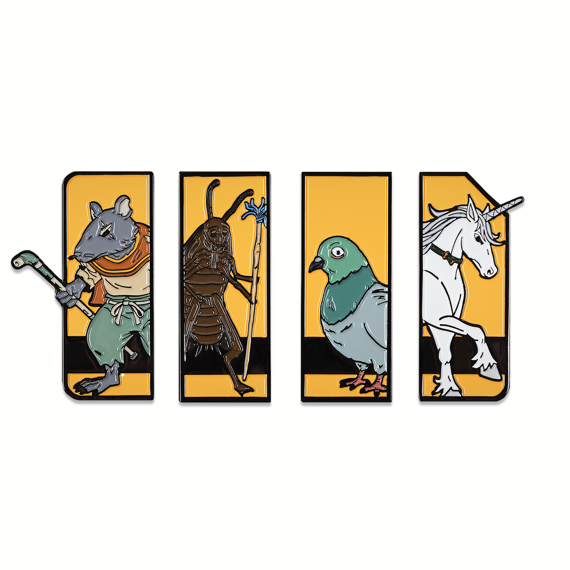 The Spicy Pidgeon, The Juicy Cockroach, The Unicorn from the tapestries at the Met Cloisters, and Kugrash aka Rat Jesus himself all come together from the world of Dimension 20: The Unsleeping City to form a MetroCard and give your pin collection some street cred.