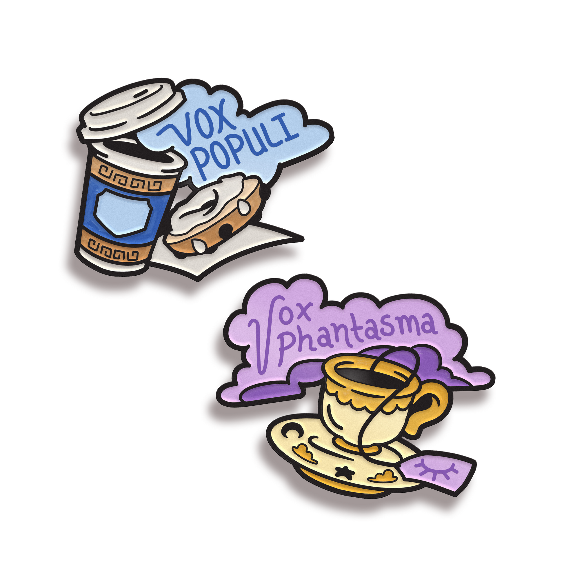 New York City is a magical place, but in the world of Dimension 20: The Unsleeping City, the magic is much more literal. The Vox Populi is the Waking World's representative for the city, and the Vox Phantasma is the representative for the Six Borough of Nod. Normally, there is never a Vox Populi at the same time as a Vox Phantasma - but when they are able to co-exist, it can be the stuff of miracles. These enamel pins co-exist to keep your lapels rad as heck. Art by Ali @devildaisies