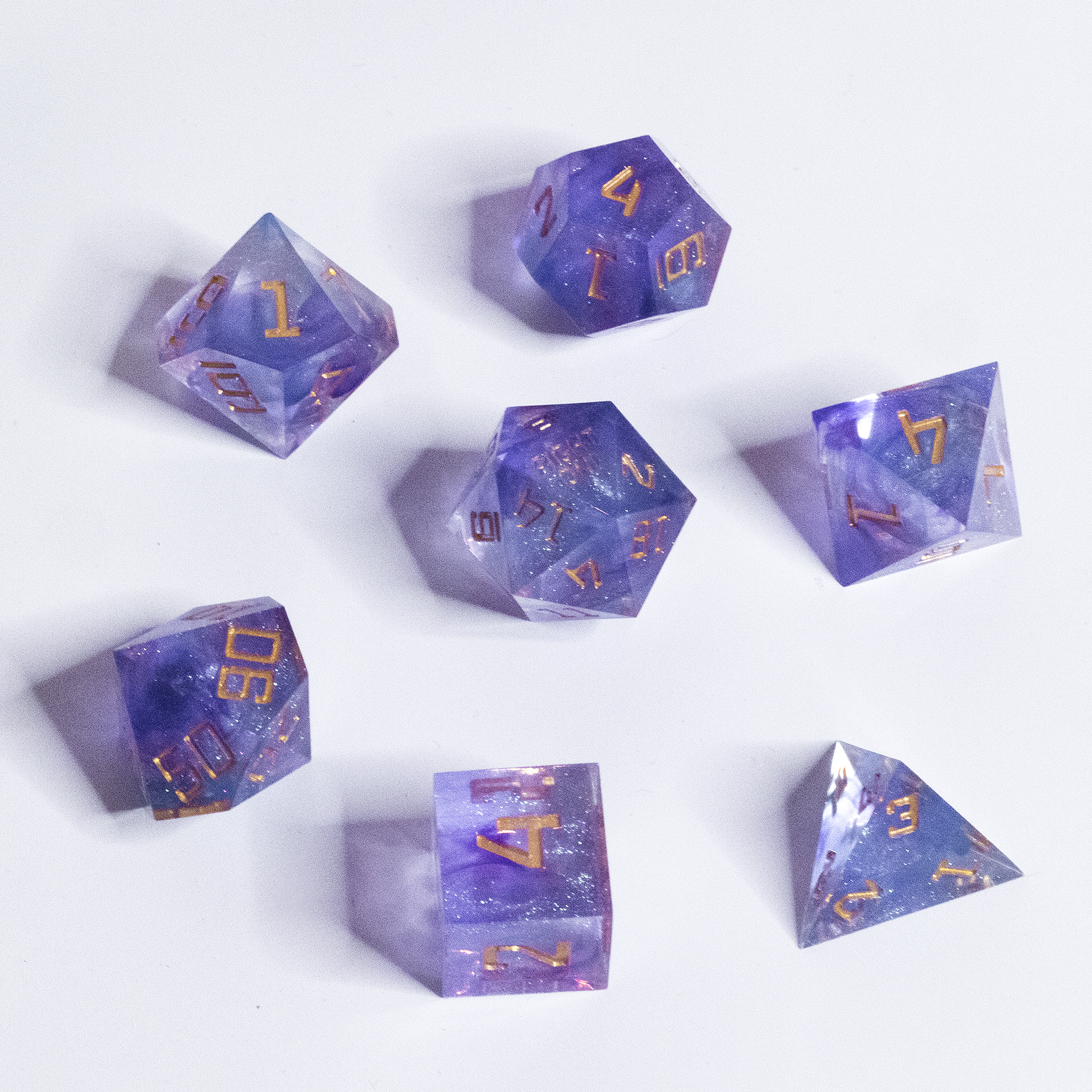 Set of seven hand-polished resin dice. Each set includes a D4, D6, D8, D10, D%, D12, and a D20. Due to the nature of the material, each set of dice will differ slightly from one another.