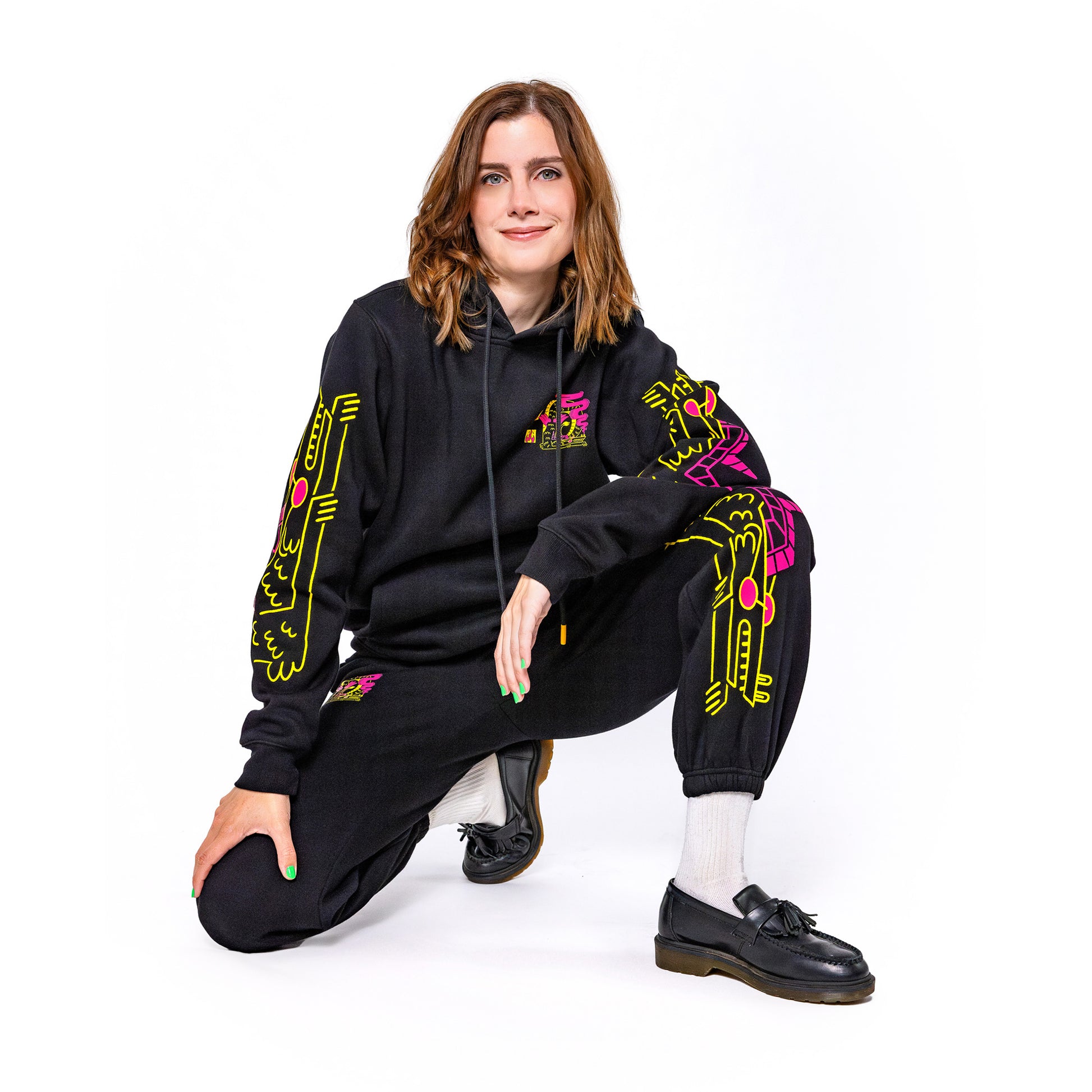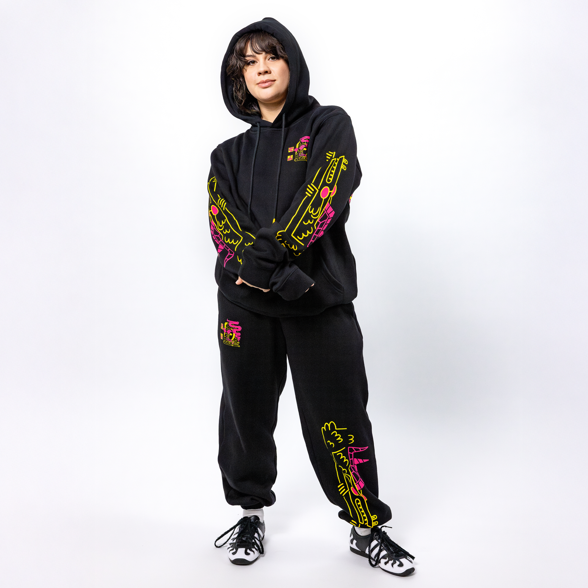 Cool jogger sweatpants to match a cool hoodie, the El Dragón joggers were inspired by a cool guy’s cool nickname in the Cash ’N Guns Episode of Parlor Room. Art by Christina Pepper Moliterno @hipepper